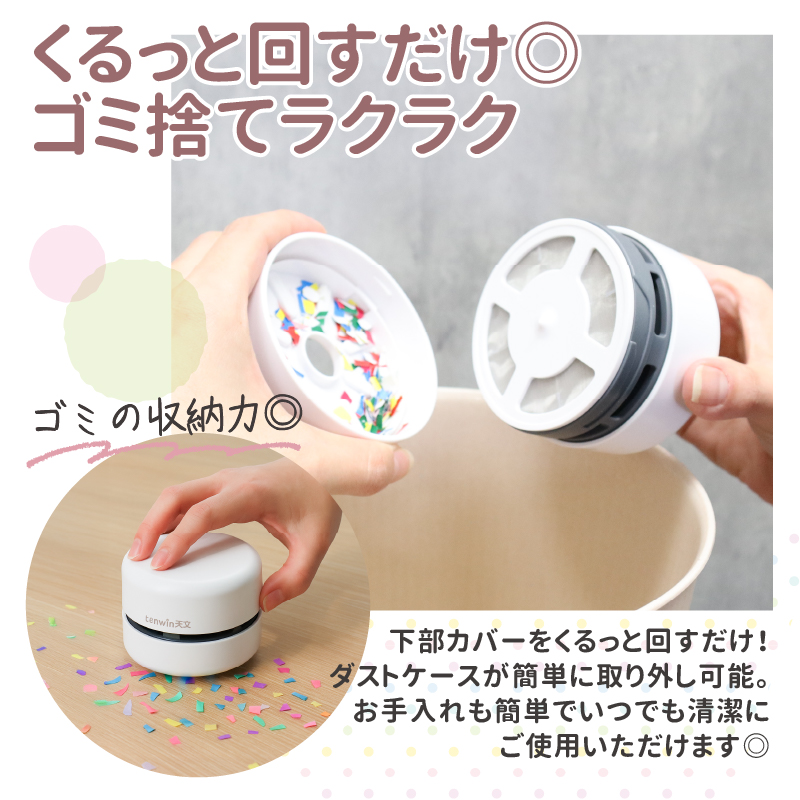・本体下部をくるっと回すだけで、ダストケースが簡単に取り外し可能。お手入れも簡単で、いつでも清潔にご使用いただけます。