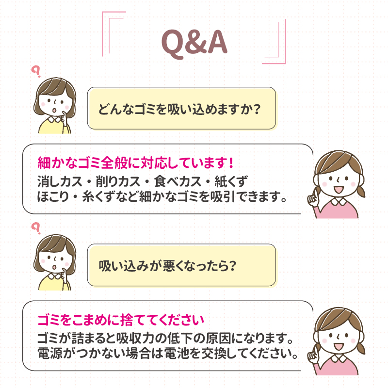 ・消しカスやホコリなどの細かいゴミも逃さずしっかり吸い取ります。
