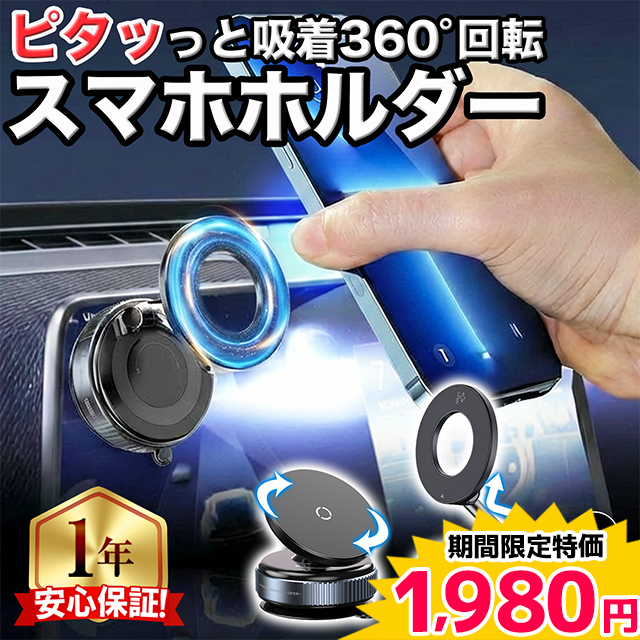 【商品説明】真空吸着でしっかり固定し、360°回転&角度調整が自由にできるマグネット式スマホホルダーです。