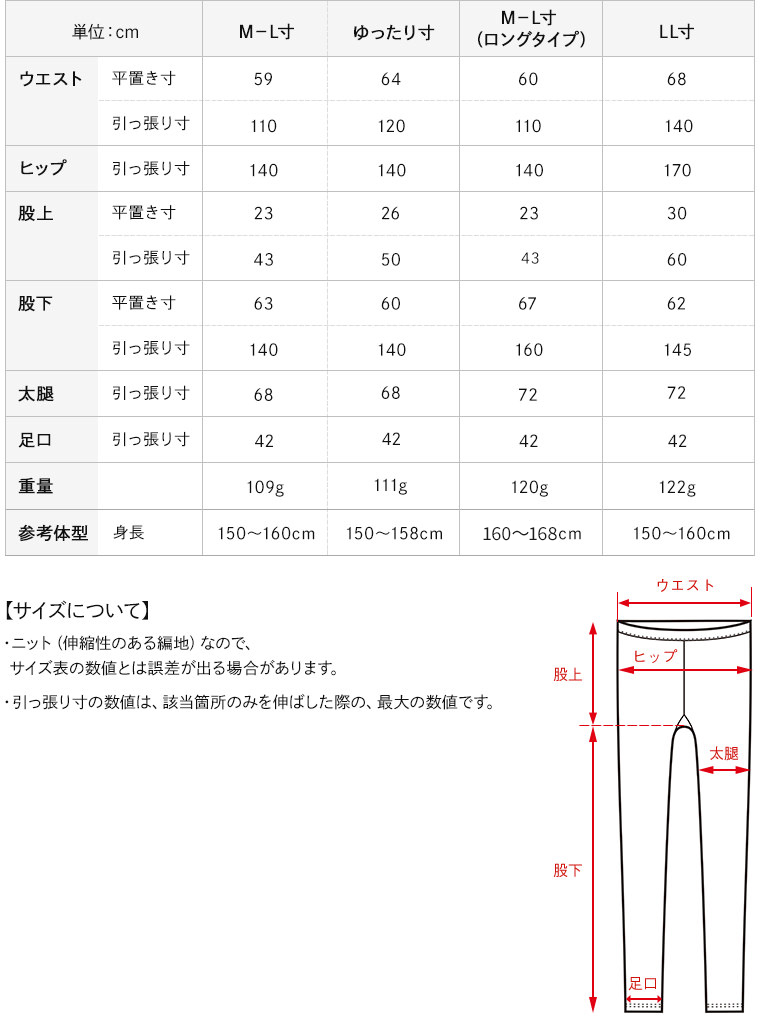股上が深いタイプがお好みの方にはゆったり寸、さらに、マタニティの方にもおすすめのビッグサイズ(LL寸)もご用意しています。