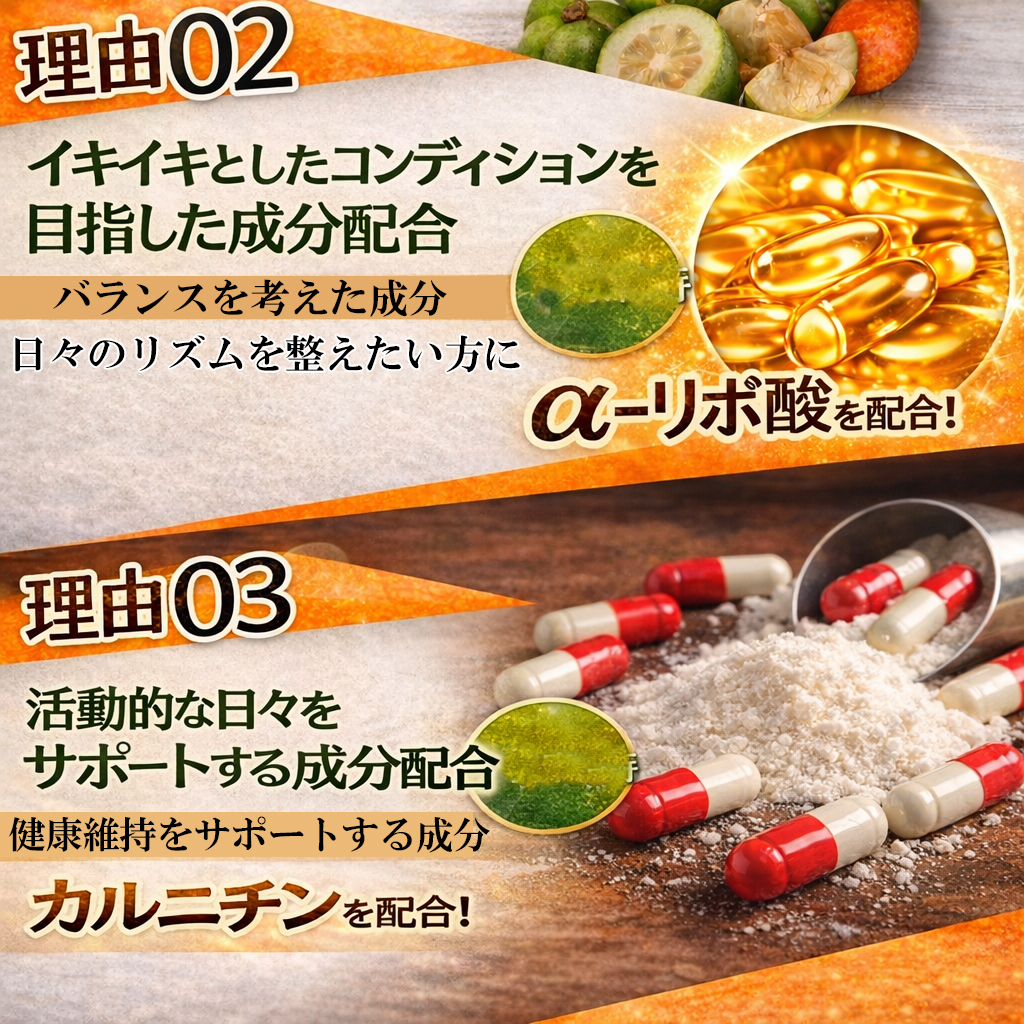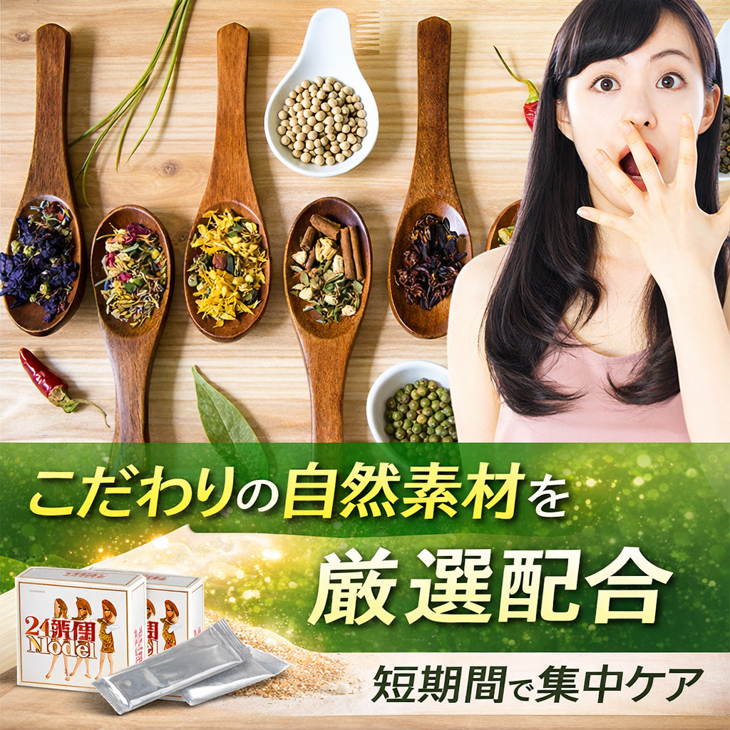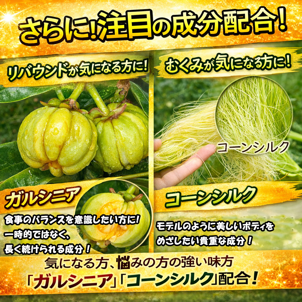 デキストリン(国内製造)、還元麦芽糖水飴、コーンシルク末、グレープフルーツ果汁パウダー (グレープフルーツ果汁、デキストリン)、エリスリトール、野草発酵エキス末(デキストリン、オリゴ糖、糖蜜、 てんさい糖、よもぎ、 ウコン、黒砂糖、ドクダミ、ハスの葉、ハチミツ、高麗人参、ウメ、ハト麦、 オトギリソウ、クマザサ、タンポポの根、エビスグサの種子、レイシ、アマチャヅル、ハブ草、トチュウ葉、オオバコ、カンゾウ、マツ葉、ナンテンの葉、アマドコロ、 ツユクサ、ツルナ、ヤマイモ、クコの実、レンセンソウ、モモの葉、イチョウ葉、 ニンドウ、イチジクの葉、ベニバナ、エゾウコギ、ラカンカ、エンメイ草、ビワ葉、モロヘイヤ、セッコツボク、 ウラシロガシ、クコ葉、スギナ、メグスリの木、カキの葉、カミツレ、カリン、シソの葉、ミカンの皮、ショウガ、センシンレン、クワ葉、キンカン、タマネギ外皮、 田七人参、キキョウ、ナツメ、サラシア、トウガラシ、ミカン、パイナップル、リンゴ、ブドウ、イチジク、グレープフルーツ、メロン、レモン、アンズ、コンブ、フノリ、シイタケ、ニンジン、タマネギ、パセリ、ダイコン、ニンニク、 ラッキョウ、キャベツ、モヤシ、マリーゴールド、 紅参、 ルイボス、 アムラの実 カルダモン、ムイラプアマ、セロリシード、ツボクサ、フェンネル、キャッツクロー)、L-カルニチンフマル酸塩、ガルシニアエキス末、ナツメ抽出物(デキストリン、ナツメエキス)、α-リポ酸、L-オルニチン/塩化カリウム、クエン酸、香料、微粒二酸化ケイ素、甘味料(アスパルテーム・L-フェニルアラニン化合物)、(一部に乳成分・りんご・やまいもを含む)