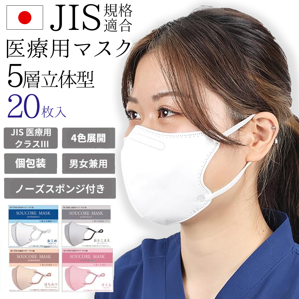 医療用 マスク SOUCORE -professional- 20枚 箱タイプ 個別包装 全4色 5層立体型 サージカルマスク 不織布 やわらか耳ひも 男女兼用 IBR アイビーアール