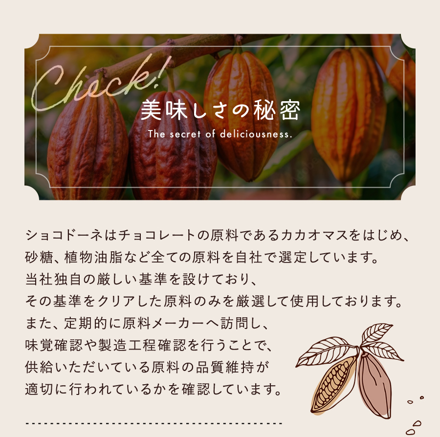 | ●チョコレートは高温になると、表面が少し溶けてその油脂分が白く固まることがあります(ブルームといいます)。風味の点で劣りますが、召し上がっても差し支えありません。 | |