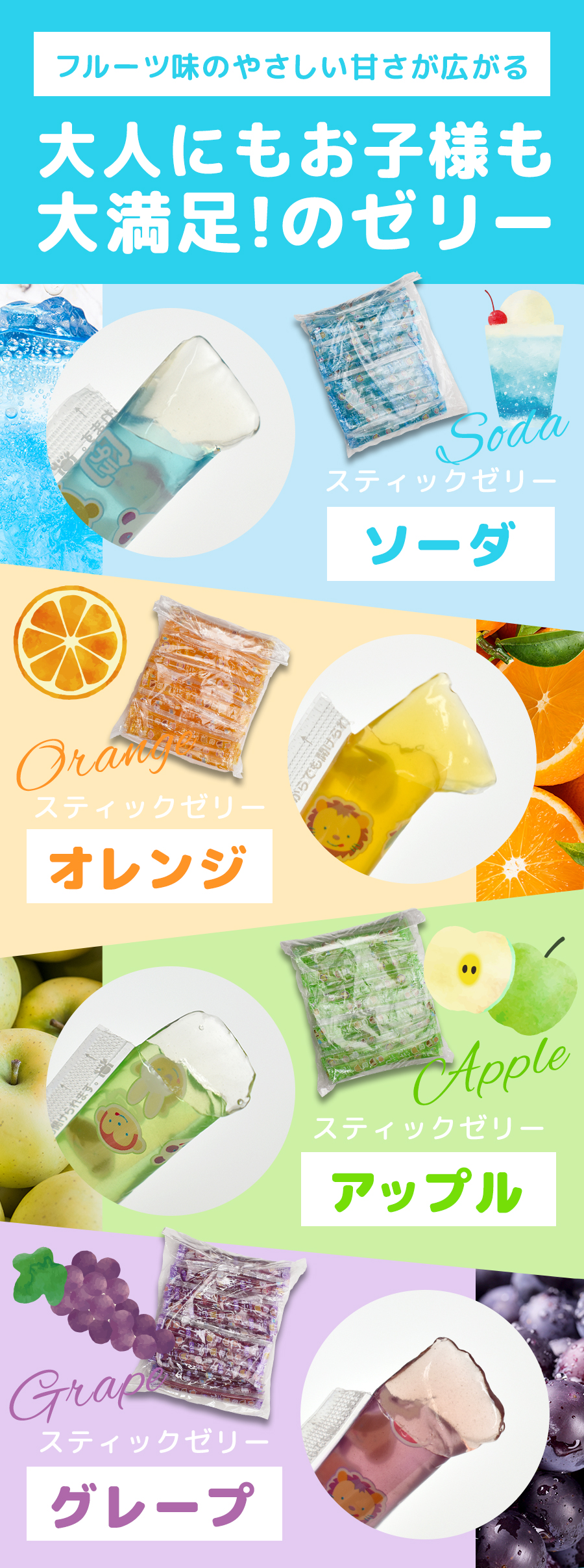 | 原材料名 | 【グレープ味】ぶどう糖果糖液糖(国内製造)、濃縮果汁(りんご、ぶどう)、寒天/ゲル化剤(増粘多糖類)、酸味料、香料、pH調整剤、着色料(アントシアニン、クチナシ)、酸化防止剤(ビタミンC) 【オレンジ味】ぶどう糖果糖液糖(国内製造)、濃縮りんご果汁、寒天/ゲル化剤(増粘多糖類)、酸味料、pH調整剤、香料、着色料(カロチン、アントシアニン)、酸化防止剤(ビタミンC) 【アップル味】ぶどう糖果糖液糖(国内製造)、濃縮りんご果汁、寒天/ゲル化剤(増粘多糖類)、酸味料、香料、pH調整剤、酸化防止剤(ビタミンC) 【ソーダ味】ぶどう糖果糖液糖(国内製造)、濃縮りんご果汁、寒天/ゲル化剤(増粘多糖類)、酸味料、香料、pH調整剤、酸化防止剤(ビタミンC) |