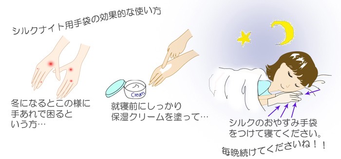 就寝前にハンドクリームを塗ってエコシルク手袋をつけておやすみください。