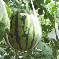 【特徴】1本の苗に1つだけしか作らず、特製のゆりかごに入れて育てる「立体栽培」で、すいかの葉や実が太陽の光を1日中まんべんなく受けられるように育てました。そのため糖度がたかく、コクのある美味しいすいかに仕上がっています。
