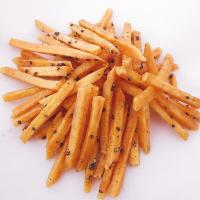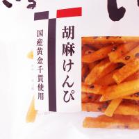 【胡麻けんぴ】すこし細めに切った黄金千貫を油で揚げて砂糖をからめ、香ばしい黒胡麻をふりかけました。さつまいもと黒胡麻は相性抜群!細切りのカリッとした食感とお芋のやさしい甘さ、胡麻の香ばしさがお口いっぱいにひろがります。