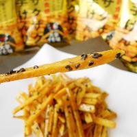そして、お子様や硬いものが苦手というお年寄りにも美味しくお召し上がりいただくため、従来の芋けんぴ(厚さ約6mm)より薄切り(約3.5mm)にカットし、香ばしい黒胡麻をまぶしました。サクサクとした食感と、黒ゴマの香りを味わえる、新しいタイプの芋けんぴです。