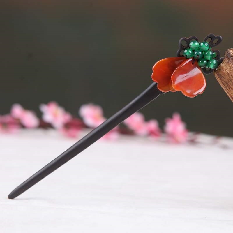 新民族風かんざし女性皿髪黒檀木瑪瑙フリンジ歩振り髪飾り手作り漢服髪飾り礼