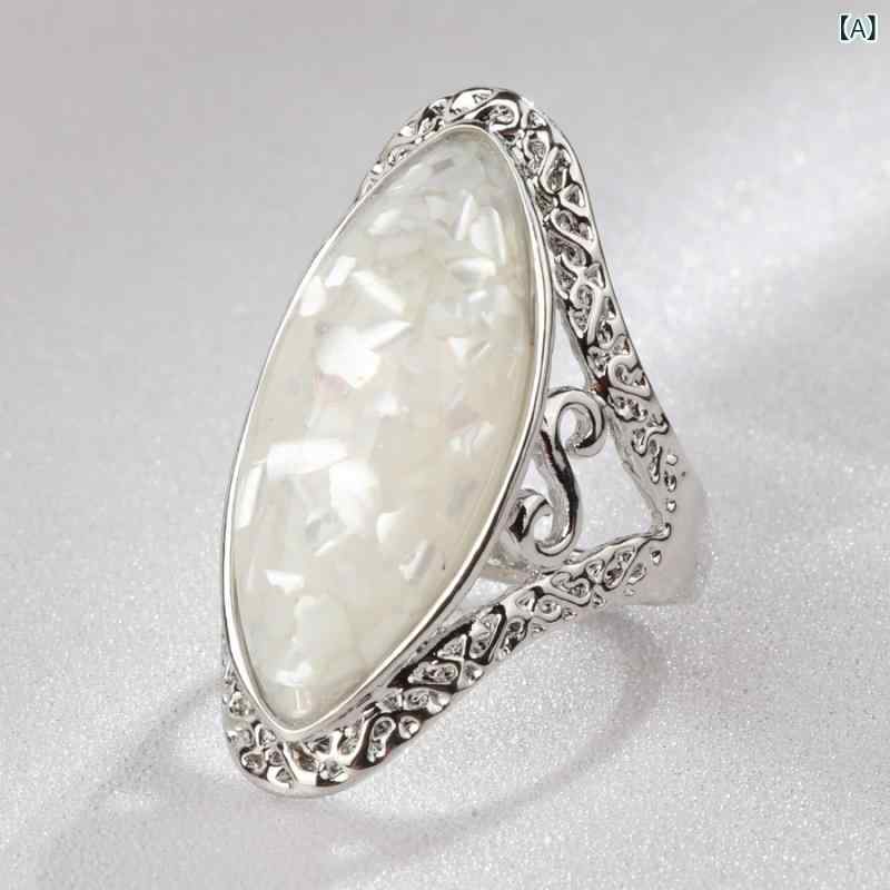 指輪 レディース ボリュームリング オーロラシェル 合金 アンティークシルバー 彫刻 幾何学模様 電気メッキ加工 レトロ ヴィンテージ風 個