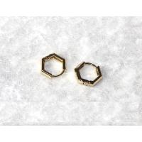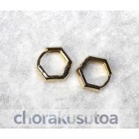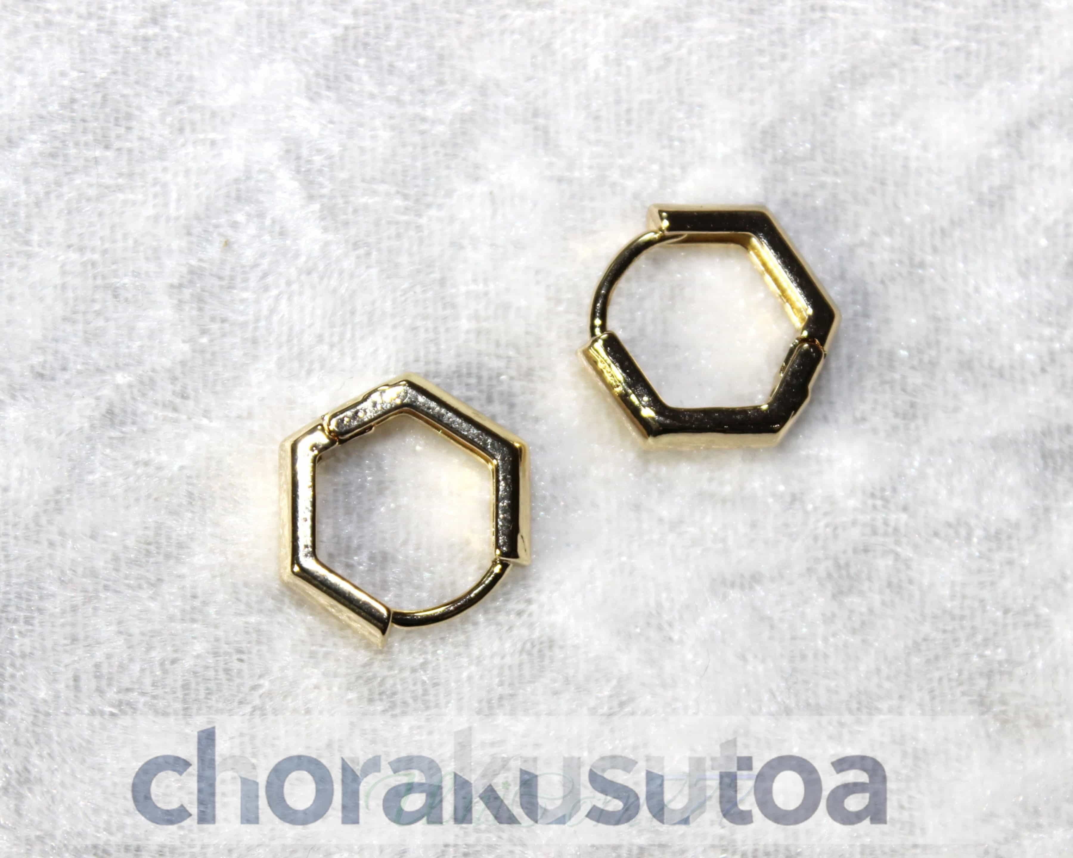 六角形の形をしたフープピアスです。【六角形の神秘】蜂の巣、トンボの目、鉱石の結晶や雪の結晶、キリンの模様、亀の甲羅など、なぜか自然界には六角形が多く見られます。その理由は、六角形は、六辺の長さの合計が短くしかも構造が強くなる(所謂ハニカム構造)ため、丈夫に空間を埋められる物理的安定性があるからだそうです。例えば、蜂の巣の六角形の構造は、同じ量の蜜を格納するのに他の形状よりも少ない材料を使用します。これは、六角形が同じ面積を持つ中で最短の辺を持つためです。また、六角形は、縁起の良い図形として知られており、「長命・長寿」「安定と調和」の象徴として知られています。日本でも昔から、「亀甲文様」として知られており、亀の甲羅のように固く身を守る様子や、寿命の長い動物である亀に由来して、長命・長寿の象徴とされていますよね。六角形の神秘。科学的には理屈が分かっても、それは後付け理論であって、生き物や大自然がなぜ六角形を形作るようになったかの不思議は解明できませんよね。面白いですよね。そんな事に想いをはせながら、このピアスを身に付けましょう(と、無理やり落ちをつけるのであった)。