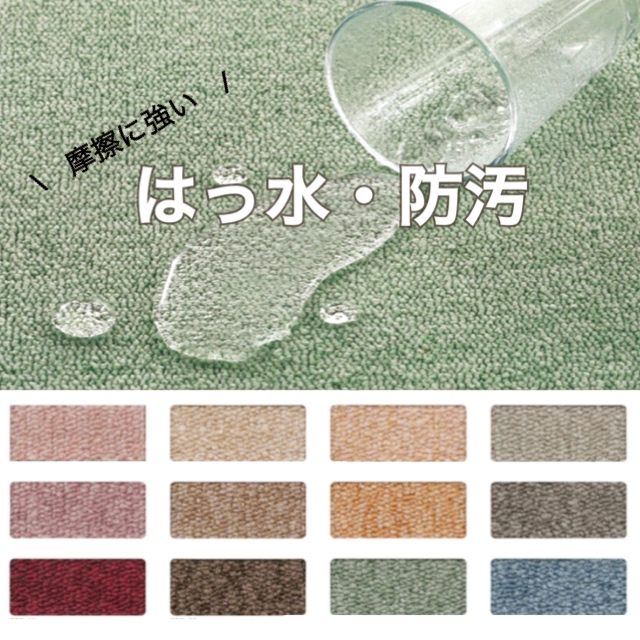 【ドアの下まですっきり敷ける、バリアフリーカーペット。撥水・はつ油加工で汚れに強いのもポイントです】