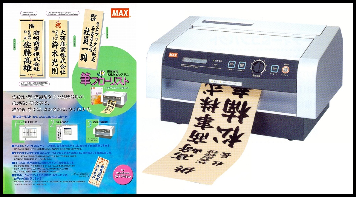 筆耕ソフト「筆フローリスト」HF-200 + 305mm巾感熱プロッタ RP-395Tのセット いずれもホッチキスメーカーのマックス社製 各種感熱ロール紙使用可能 305mm×1100mmが最大最長サイズ 用紙は巾、長さとも色々なサイズあります。 ※パソコン Windows 7/8/8.1/10/11対応 ソフトはCD-ROMにて供給