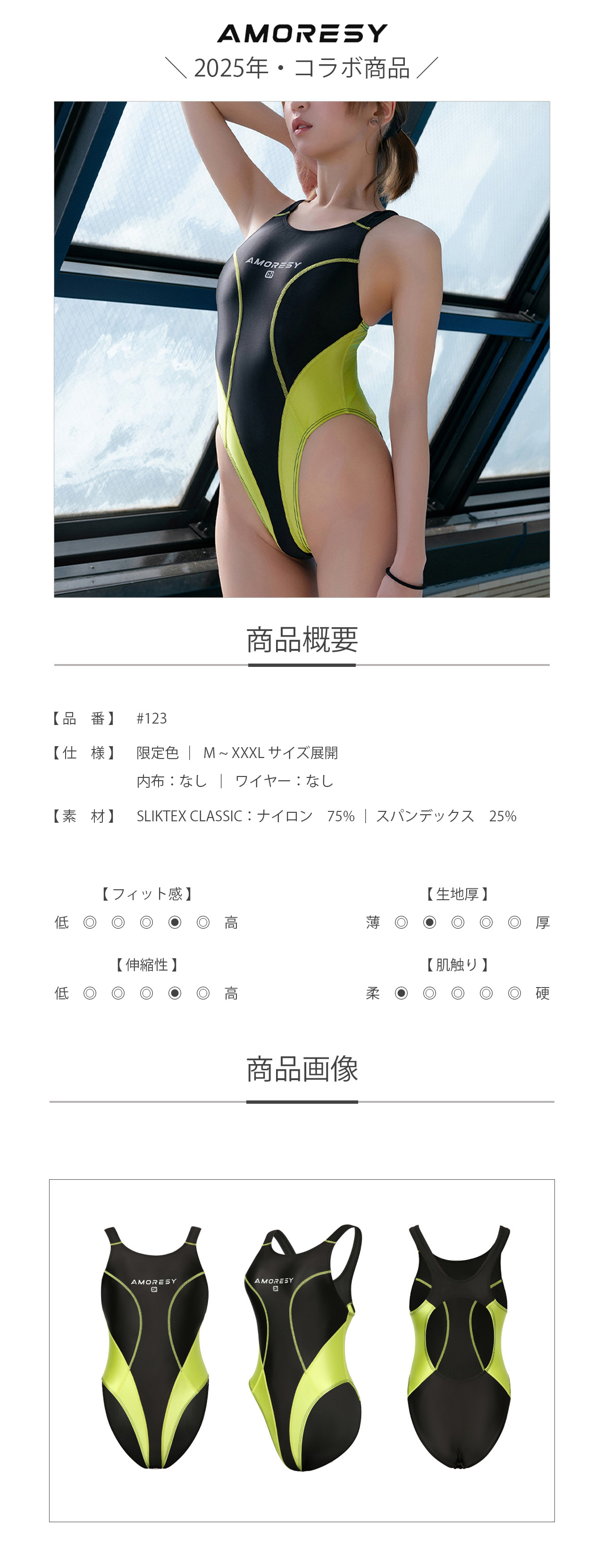 SLIKTEX CLASSIC素材(AMORESYのオリジナル素材)を使用し、抜群の伸縮性と快適な着心地を提供。