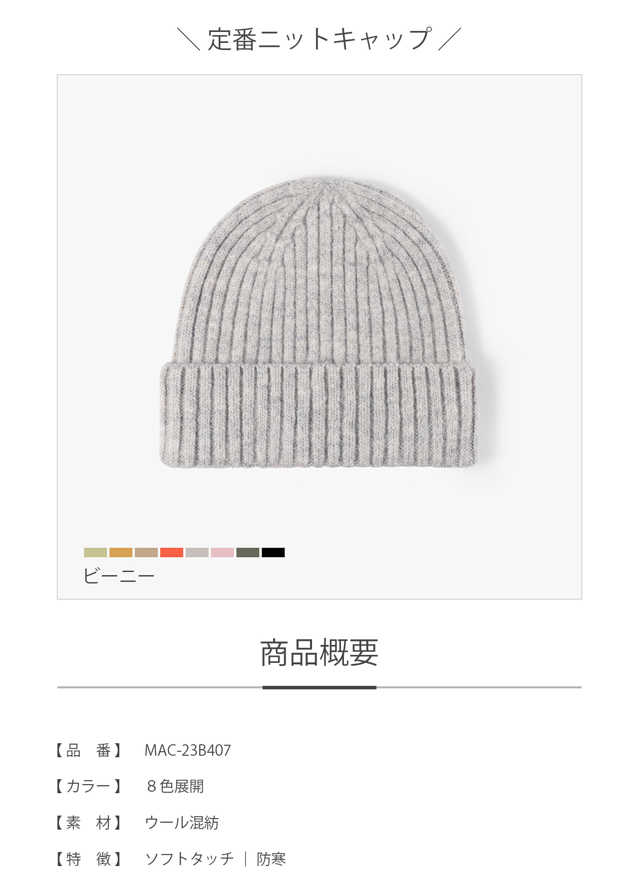 寒い季節に欠かせない、シンプルで使いやすい定番ニットキャップ。