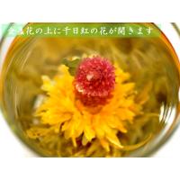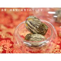 最近の中国茶ブームの中でも、特に人気が有るのが花入りの工芸茶です。ジャスミンの茶葉に色鮮やかな花々を閉じ込めたこれらの工芸茶は、中国の茶職人により、一粒一粒手作りで丹念に作られています。一人分ずつサーブでき、ガラスの茶器などに入れて茶葉が開いていく様子をお楽しみ頂けるため、高級中華料理店で、コースの最後にアクセントとして出されるお店が増えています。もちろん個人で飲むにも一回分だけお気軽に入れられ、また色々な形が楽しめるため、中国茶ファンに大変人気があります。本商品【旭日東昇】は団栗型の茶葉にお湯を注ぐと、ジャスミンの爽やかな香りが立ち上り、中から千日紅の花が二段、金盞花の上に昇ります。