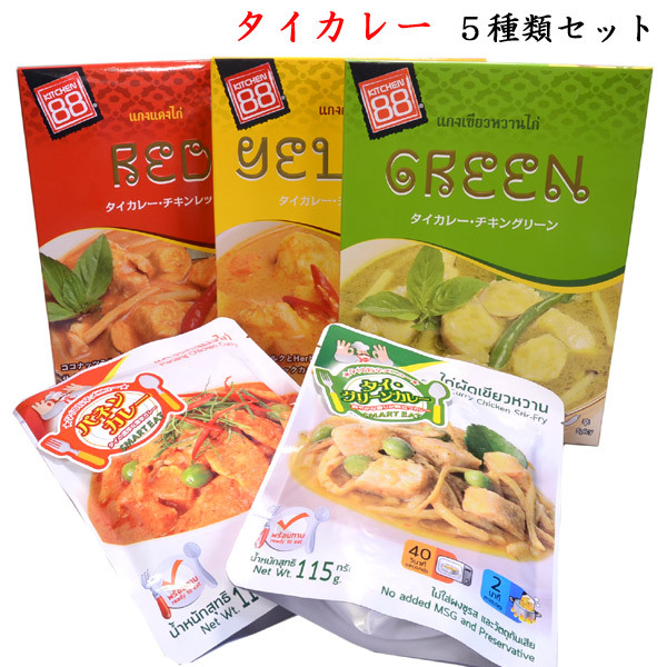 ・セット内容 チキングリーン/チキンレッド/チキンイエロー/タイグリーンカレー/タイパネンカレー 各1袋