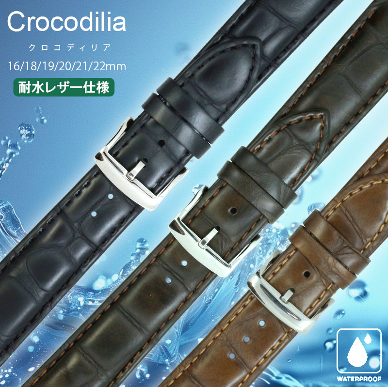 腕時計ベルト 腕時計 耐水レザーベルト クロコディリア・カーフ CHRONOWORLD クロノワールド【交換工具・ばね棒つき】