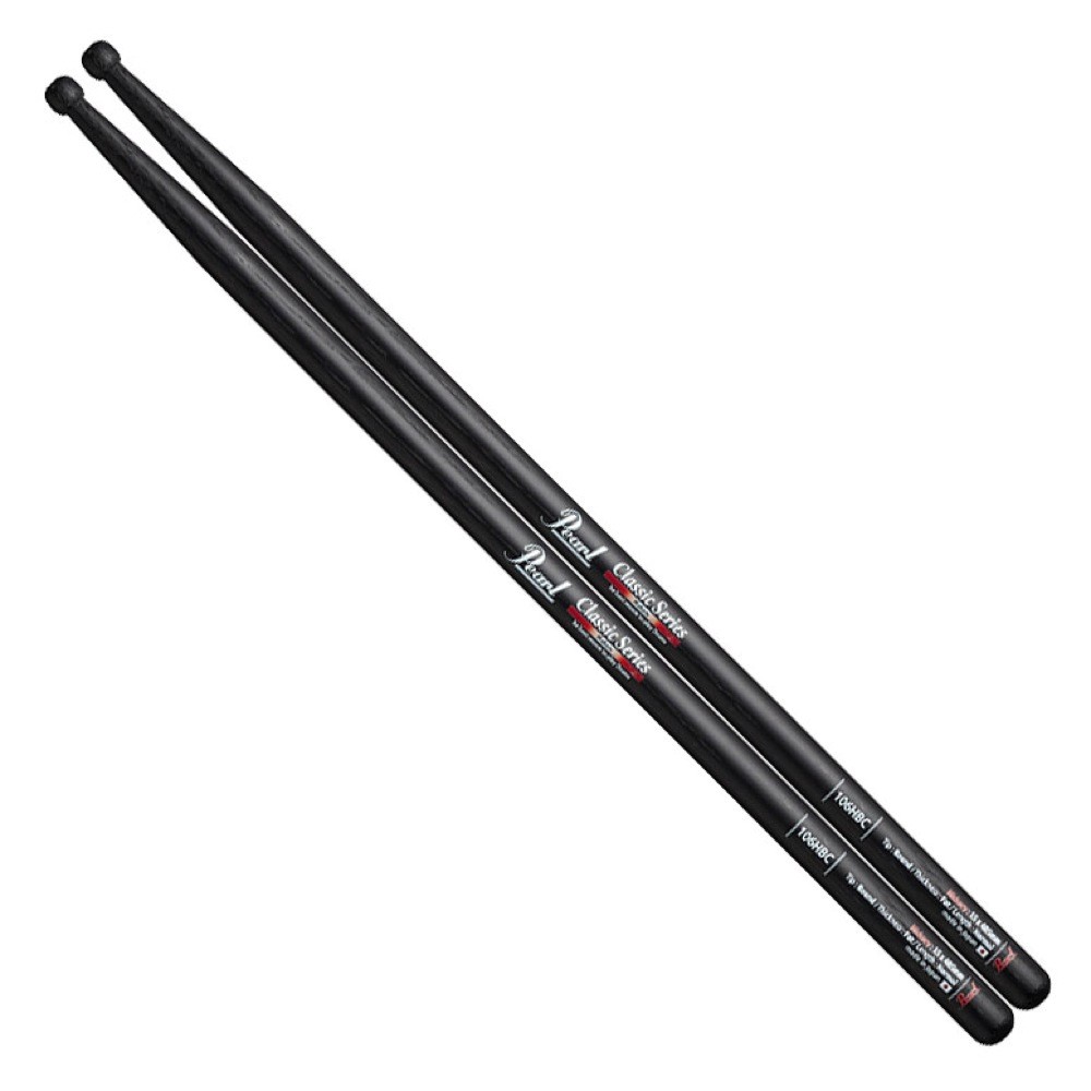 パール スティック 106HBC ヒッコリー ドラムスティック Pearl。パール・ドラムスティック Classic Series106HBC適度なしなりでスティックでは最もポピュラーなヒッコリー材を使用。太めのスティックでパワーが出しやすく、球状のチップで、粒立ちのよい常に安定したサウンドが出せるモデル。ヒッコリーブラックラッカー仕上げ15×405mmTip:RoundTaper:S村上\“ポンタ\”秀一モデル1セットでの販売です。