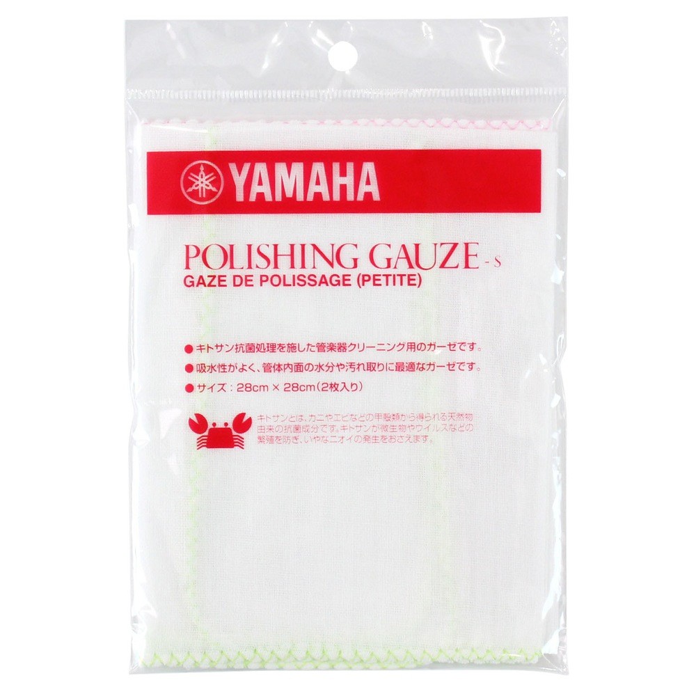 ヤマハ ポリシングガーゼ PGS2 は、楽器内面の水分や汚れ取りに最適なガーゼです。キトサン抗菌処理を施してあります。キトサンとはカニやエビなどの甲殻類から得られる天然由来の抗菌成分です。キトサンが微生物やウィルスなどの繁殖を抑え、いやなニオイの発生をおさえます。また従来のガーゼに比べ織糸を増やし、生地の目を詰めたことで強度がアップしました。