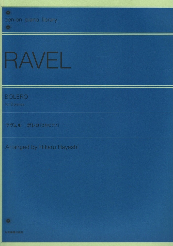 全音楽譜出版社全音ピアノライブラリー ラヴェル ボレロ 2台ピアノ版 林光 編曲 【楽譜】林 光の編曲による2台ピアノのための「ボレロ」。ラヴェル自身による2台ピアノ編曲版は、片方のパートがひたすらリズム伴奏を受け持つアレンジになっていますが、この林 光による編曲版は、第1ピアノと第2ピアノが交互に入れ替わるため、両方のパートが主役になれるように編曲されています。同じメロディの繰り返しが、ピアノの音色だけで面白いのだろうか? という疑問はたちどころに吹き飛んでしまうような、繊細にして大胆な編曲です。原曲のちょうど半分の長さになっており、コンサート・レパートリーとして最適です。