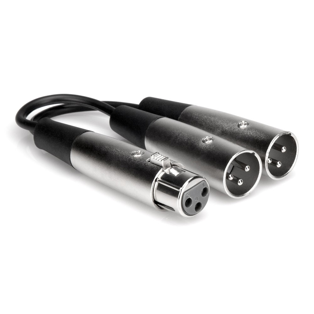 Hosa YXM-101.5 45cm XLRキャノンメス-XLRキャノンオスx2 YケーブルXLRメスとXLRオス×2を採用したYケーブルです。1つのマイク音声をミキサーやオーディオインターフェイスのLR2つのチャンネルに割り当てる場合などに便利な分岐ケーブルです。長さ:18inch(約45cm)プラグ:XLRキャノンメス - XLRキャノンオスx2