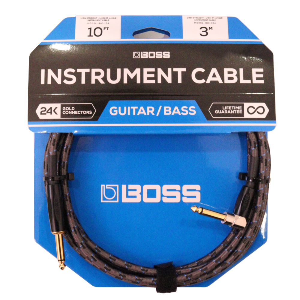 ギターシールド 3m SL BOSS ボス BIC-10A ギターケーブル。ギターからエフェクターやアンプなどの接続に適したL型−ストレート型、長さ3mのケーブル。ギターからエフェクターやアンプなどの接続に適した1/4インチプラグ、L型−ストレート型、長さ3mのケーブルです。スタジオグレードの24金メッキプラグ、無酸素銅の線を採用。しなやかで耐久性に優れています。【特徴】・24金メッキコーティングの1/4インチプラグ。・しなやかで扱いやすく、すぐれた耐久性。プラグ:SL(ストレート型-L型)長さ:3m