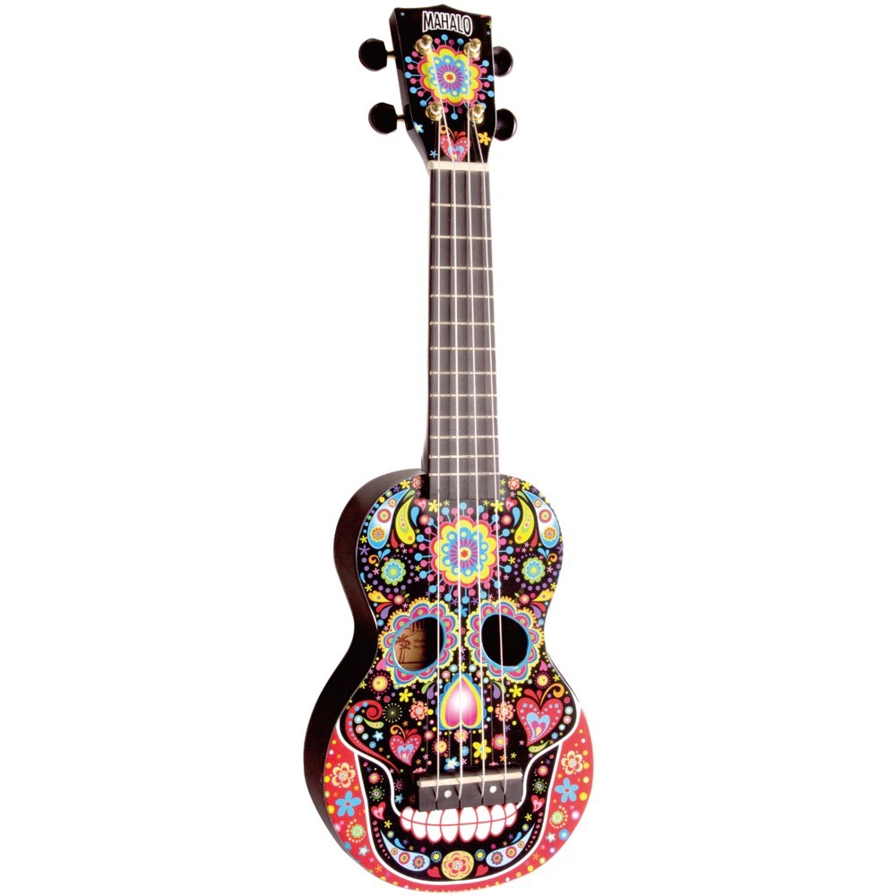 MAHALO MA1SK BK アートシリーズ ソプラノウクレレ スカル。メキシコで再生の象徴とされ、死者の日に飾られるポップでカラフルなスカル、「シュガースカル」を彷彿とさせるビビットでカラフルなモデルです。アンサンブルの中でもひときわ目を引くこと間違い無しのモデルです。