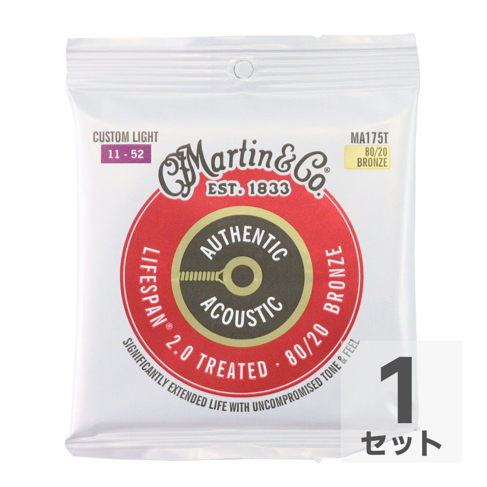 マーチン アコギ弦 MARTIN MA175T Treated with Lifespan Bronze Custom Light アコースティックギター弦 マーティン・ストリングスがメインとなる製品をリニューアルし、新たに「オーセンティック・アコースティック」シリーズとして、「Lifespan 2.0」が登場しました。 レッドのパッケージの「ライフ・スパン2.0弦」は、SP弦を特殊な液体に浸すトリートメント加工を施したロングライフ弦です。従来はクリアトーン社で行っていたトリートメント加工をマーティン社で行うようになりました。さらに弦の寿命も向上すると共に、ブライトなトーンと滑りやすく弾きやすいのが特徴です。 Treated with Lifespan 2.0 Custom Light カスタムライトゲージ:011 015 023 032 042 052