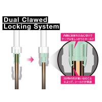 なぜこれほど簡単なのに導通不良や短絡を起こさず、長期に渡って使い続けることが可能なのか。その理由は、特許出願中でもあるプラグロック機構 "Dual clawed lock system" にあります。ケーブルの外装シースに2か所の爪が食い込むことによってシールドが導通、さらにフランジ部の内径に刻まれたねじ切りがケーブルをしっかりとホールドします。