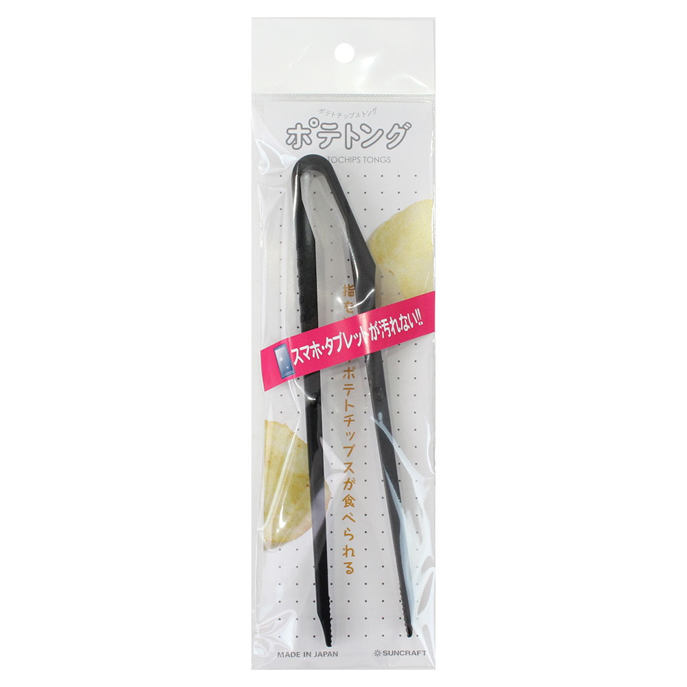 SUNCRAFT PCT-01 ポテトング ブラック楽器やパソコン、ゲームをしながら、指先の汚れを気にしないでポテトチップスが食べられます。楽器やキーボード、コントローラも汚れません。このトングはポテトチップスなどのスナック菓子を軽い力で、はさんで取ることができます。他にも海苔や漬物などに使っても便利です。指が油でベトベトしない。指が汚れない。箸のように持っても使いやすい形。置いても先端がテーブルにつきません。カラー:ブラック品質表示:ポリプロピレン(耐熱温度90℃)日本製