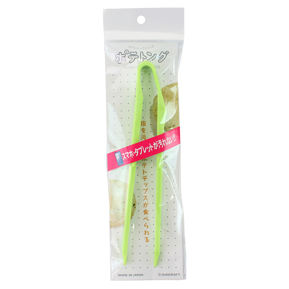 SUNCRAFT PCT-03 ポテトング グリーン楽器やパソコン、ゲームをしながら、指先の汚れを気にしないでポテトチップスが食べられます。楽器やキーボード、コントローラも汚れません。このトングはポテトチップスなどのスナック菓子を軽い力で、はさんで取ることができます。他にも海苔や漬物などに使っても便利です。指が油でベトベトしない。指が汚れない。箸のように持っても使いやすい形。置いても先端がテーブルにつきません。カラー:グリーン品質表示:ポリプロピレン(耐熱温度90℃)日本製