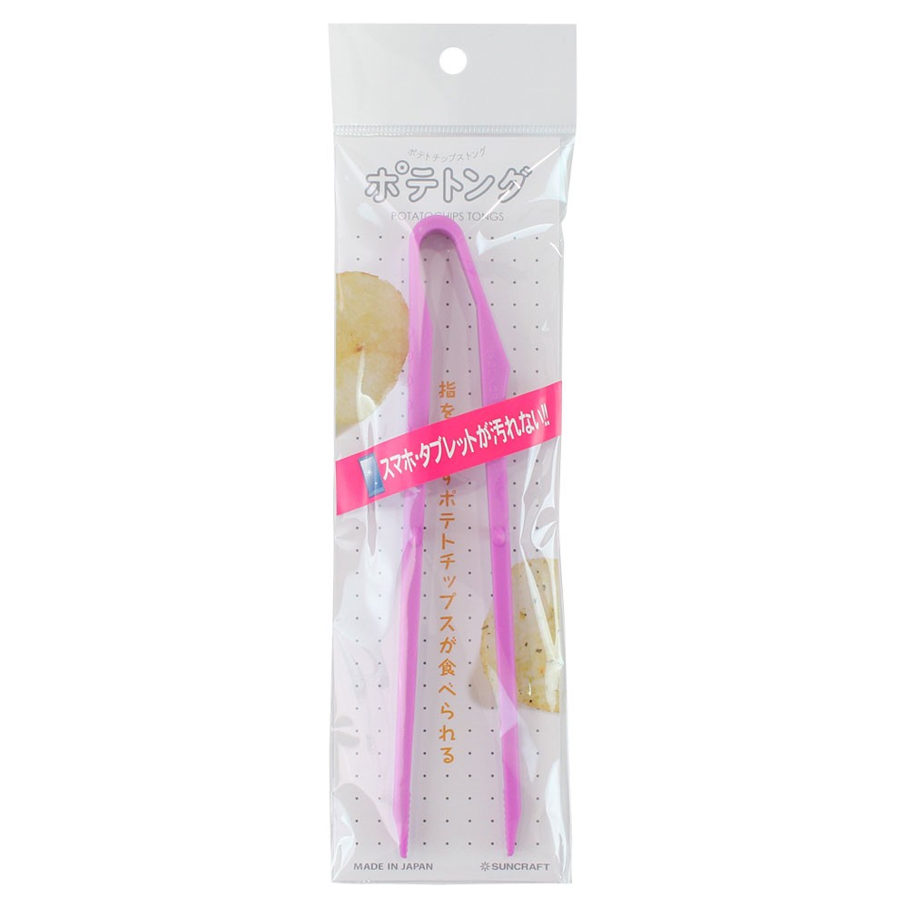 SUNCRAFT PCT-05 ポテトング パープル楽器やパソコン、ゲームをしながら、指先の汚れを気にしないでポテトチップスが食べられます。楽器やキーボード、コントローラも汚れません。このトングはポテトチップスなどのスナック菓子を軽い力で、はさんで取ることができます。他にも海苔や漬物などに使っても便利です。指が油でベトベトしない。指が汚れない。箸のように持っても使いやすい形。置いても先端がテーブルにつきません。カラー:・パープル品質表示:ポリプロピレン(耐熱温度90℃)日本製