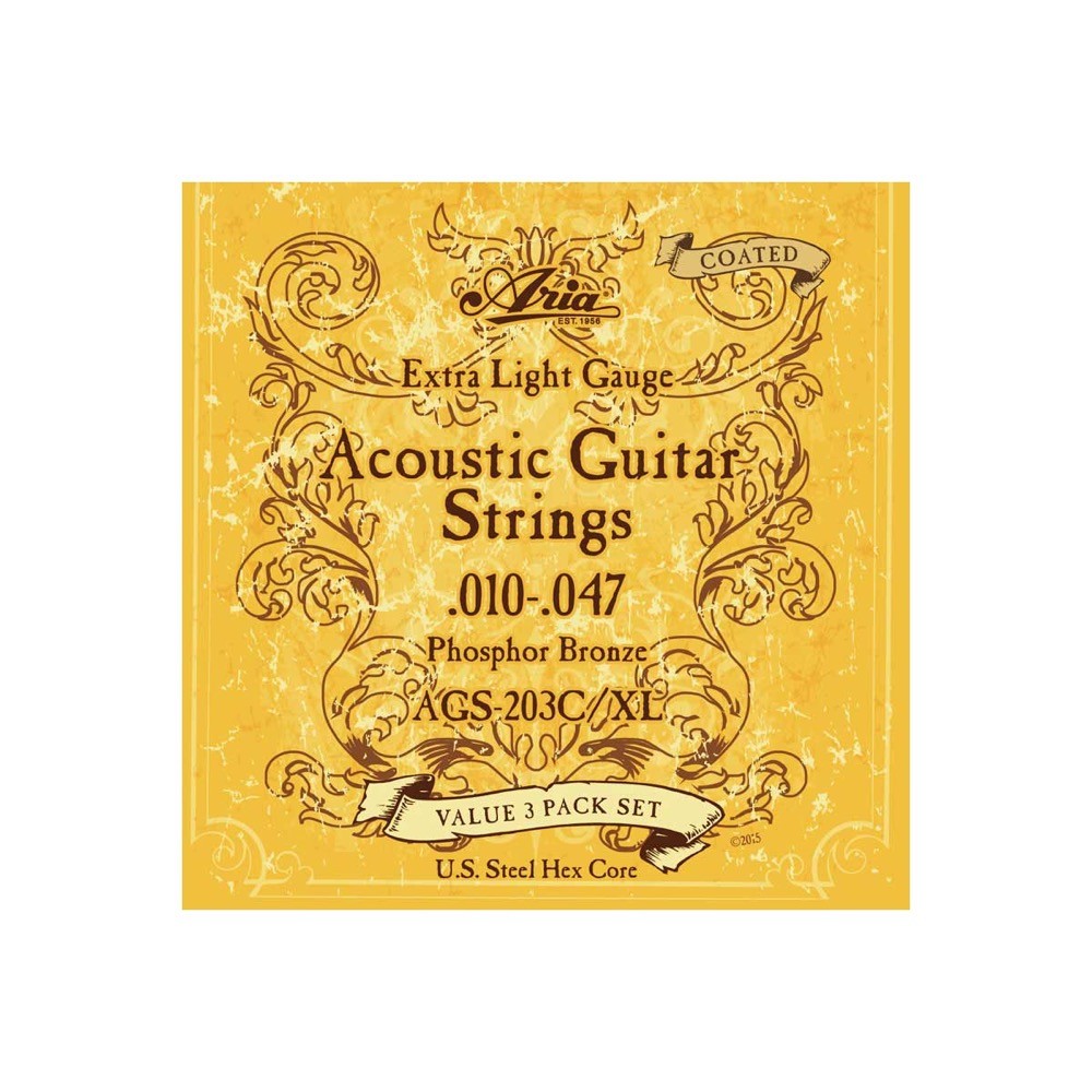 ARIA AGS-203C/XL アコースティックギター弦 3セットパック-Coated, Extra Light, 3sets- Acoustic Guitar芯線には上質な6角芯を採用したコーティングストリングス。極薄いテフロンで弦をコーティングする事により、より錆びにくく、弦の寿命を長持ちさせます。フォスファー・ブロンズ、3セットパック.010/.014/.023/.030/.039/.047