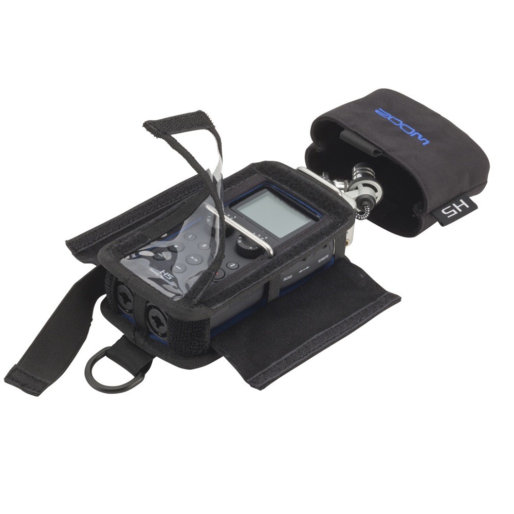 ZOOM PCH-5 H5専用 プロテクティブケース※画像はサンプルです。H5本体は付属致しません。『PCH-5』は、ハンディレコーダーH5専用にデザインされたプロテクティブケースです。ポータビリティや操作性を損なわずに、H5本体を保護します。防水素材と透明なウィンドウカバーの採用により、雨やホコリによるダメージから本体を保護しながら、液晶画面で録音状況等をモニターすることが可能。ウィンドウカバーを開ければ、直接ボタンやノブに触れて操作することもできます。ボトムカバーおよびサイドカバーは、ベルクロ式で自在に開閉可能。外部XLR入力やヘッドフォン端子など、必要な部分だけを開けて利用することができます。内蔵マイクを保護するマイクカバー、身に着けて持ち運べるベルトループ、ストラップ等に取り付けられるDリングも用意されています。