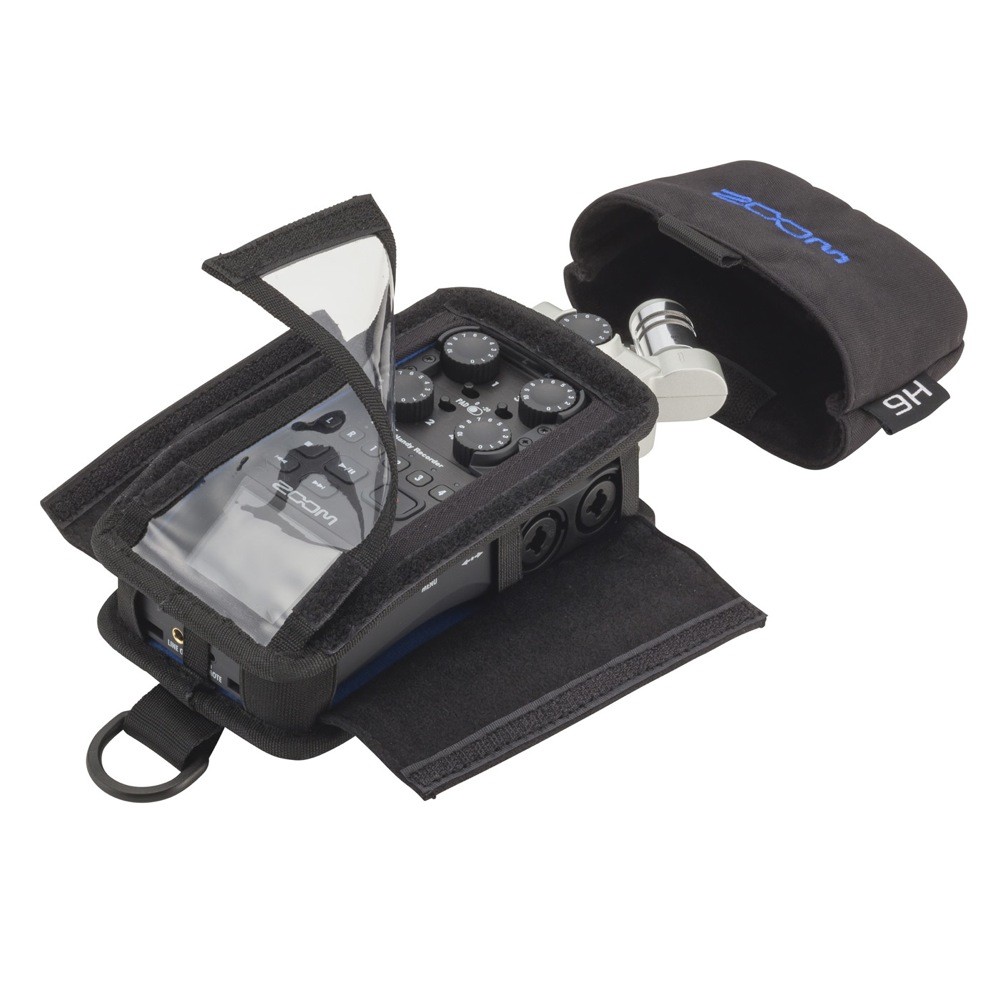 ZOOM PCH-6 H6専用 プロテクティブケース※画像はサンプルです。H6本体は付属致しません。『PCH-6』は、ハンディレコーダーH6専用にデザインされたプロテクティブケースです。ポータビリティや操作性を損なわずに、H6本体を保護します。防水素材と透明なウィンドウカバーの採用により、雨やホコリによるダメージから本体を保護しながら、液晶画面で録音状況等をモニターすることが可能。ウィンドウカバーを開ければ、直接ボタンやノブに触れて操作することもできます。ボトムカバーおよびサイドカバーは、ベルクロ式で自在に開閉可能。外部XLR入力やヘッドフォン端子など、必要な部分だけを開けて利用することができます。内蔵マイクを保護するマイクカバー、身に着けて持ち運べるベルトループ、ストラップ等に取り付けられるDリングも用意されています。