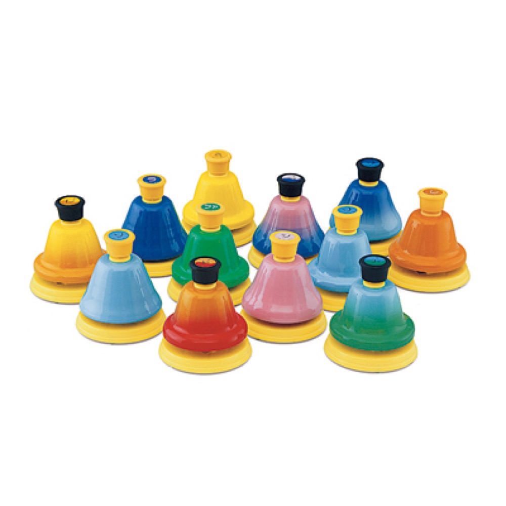 SUZUKI MBD-12 ベルハーモニー デスクタイプ MBD-8、MBD-5にプラスして音域を上下に広げる12音セットです。MBD-8、MBD-5、MBD-12の3セットを揃えると、25音となり、2オクターブをカバーします。本商品は机などの上に置き、キャップを叩いて演奏するベルです。置き方を工夫することで様々な演奏が可能で、動きやあそびの要素を取り入れやすいでしょう。また、ベルを持ち替える必要が無いので、一人でより多くの音を演奏できます、複数の楽器を担当しても良いでしょう。[色で音が分かるベルがセットに]ベルハーモニーは音別に色分けさせたベルがセットになっています。[幹音は単色、派生音は2トーン]幹音はベルの色が単色で柄やキャップの色が黄色。派生音はベルの色が2トーンで柄やキャップの色が黒です。音域:12音 g1〜b1、c#3〜g3(派生音含む)材質:スチールベル ABS(台座・ハンマー)エラストマーキャップ 寸法:φ80×95mm重量:110g(1音)