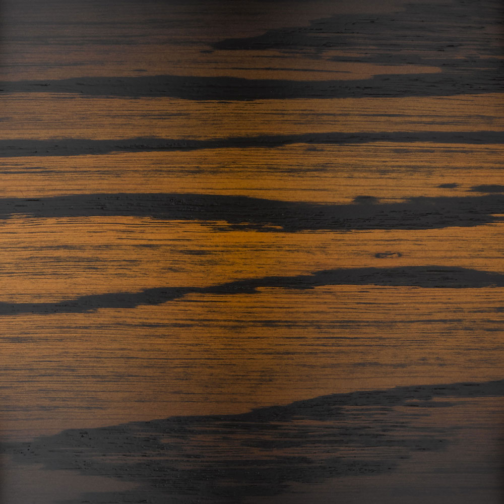 日本の伝統的な木材加工方法である「浮造り\“UZUKURI」の技術を用いたシェルフィニッシュ。シェルの塗装前に木目のやわらかい部分のみを削って表面に凹凸をつけ、凹部のみ黒い塗料にて着色することで凸部が浮き上がって見える為、オーク材特有の美しい木目が強調される豪華な木工・塗装仕上げです。