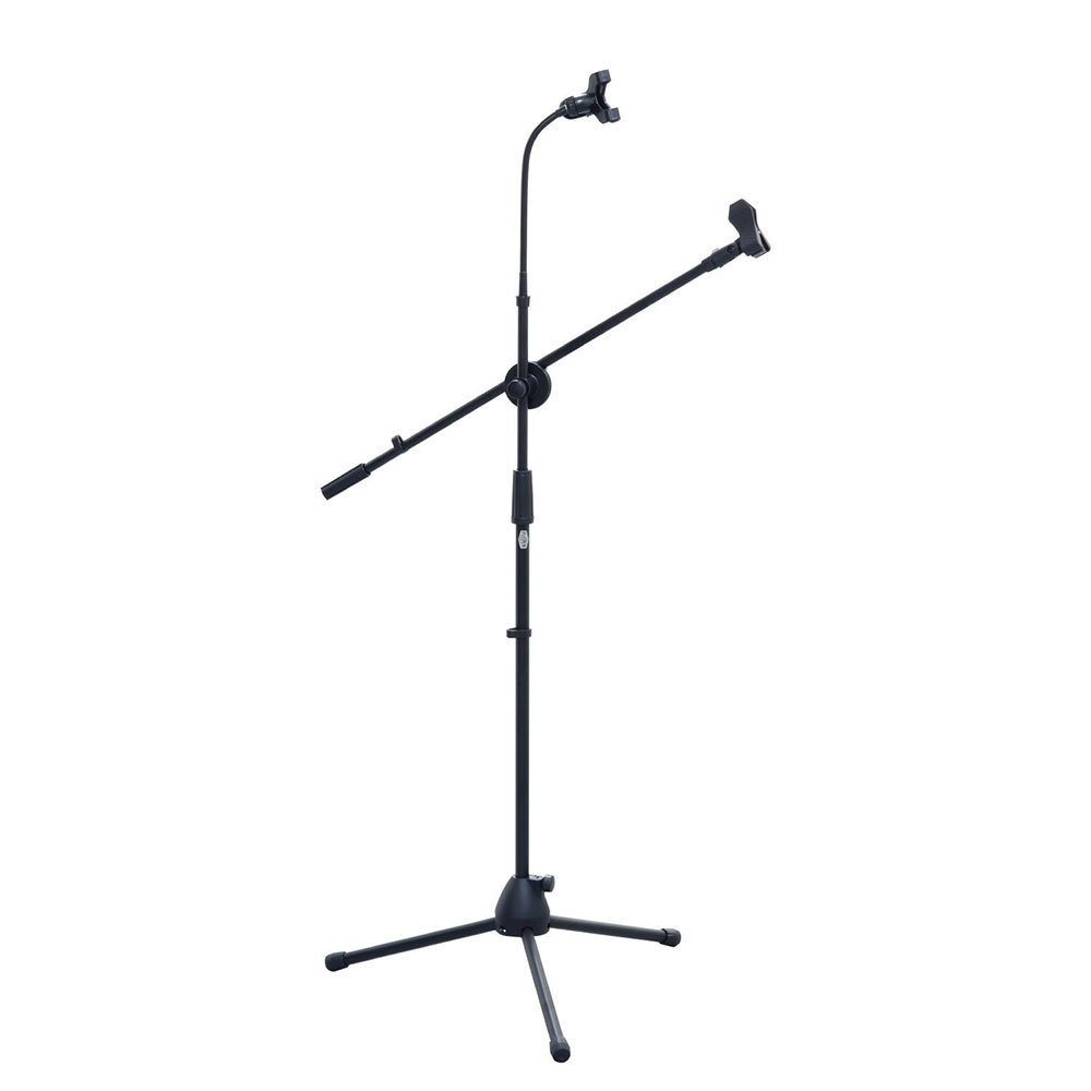 スマホスタンドと、マイクスタンドがひとつになったスタンドです。スマホスタンド部分はグースネックになっており、お好みの位置に手軽に自由に調節可能。 楽譜やコードを確認したり、ライブアプリでライブ配信の際マイキングと撮影をこれ一本で行えます。 マイクのブーム部は上下調節も可能なので、アコースティックギターのマイキングはもちろん、ボーカルマイクとしての使用も可能です。本体重量1460gと非常に軽量。高さは820~1340mmと多くのシチュエーションで活躍します。マイクホルダーは幅広いマイクに使用可能なクリップタイプを付属。ご家庭での使用も想定し、床を傷つけにくいソフトな足キャップを装備しています。