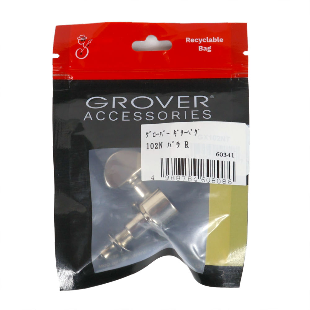 GROVER 102N R ギターペグ 1個※ギターパーツの取り扱いには、相応の技術と知識が必要になります。自己責任にて、取り扱い可能な方のみ、ご検討下さい。個人的に取り付け時に起こった、楽器及びパーツの破損・損傷等につきましては当店は保証出来ません。あらかじめご了承下さい。グローバーの102シリーズはロートマチックタイプのギター用ペグで、3対3の配列を持つ大変ポピュラーな糸巻きです。ギア比はオーソドックスな14:1です。エレキギターだけでなく、アコースティック・ギターにも幅広く使われているモデルです。ギター正面から見て右側のペグ1個の単体売りです。ナット、ワッシャー、取付けネジが付属します。SPEC■Type: 3対3■Finishes: Nickel■Hole Size: 25/64" (約9.922mm)■ギア比: 14 : 1