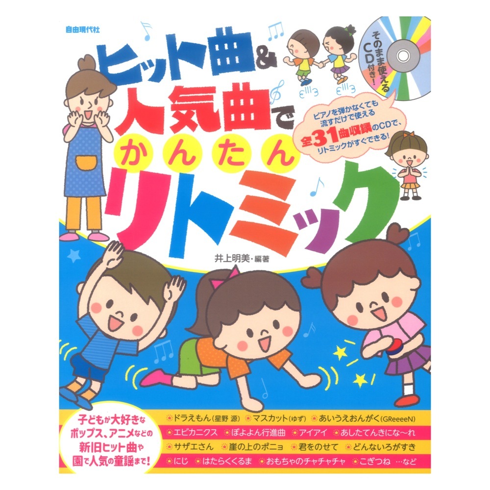 自由現代社ヒット曲&人気曲でかんたんリトミック 【音楽書】子どもが好きなポップス、アニメなどの新旧ヒット曲から園で人気の童謡までを使ったリトミック教本です。全曲CD収録ですので、先生がピアノを弾く必要もなく、すぐに使えます。【収録予定曲】ドラえもん(星野源)/エビカニクス/あいうえおんがく/崖の上のポニョ/君をのせて/はたらくくるま/うれしいひなまつり…など。