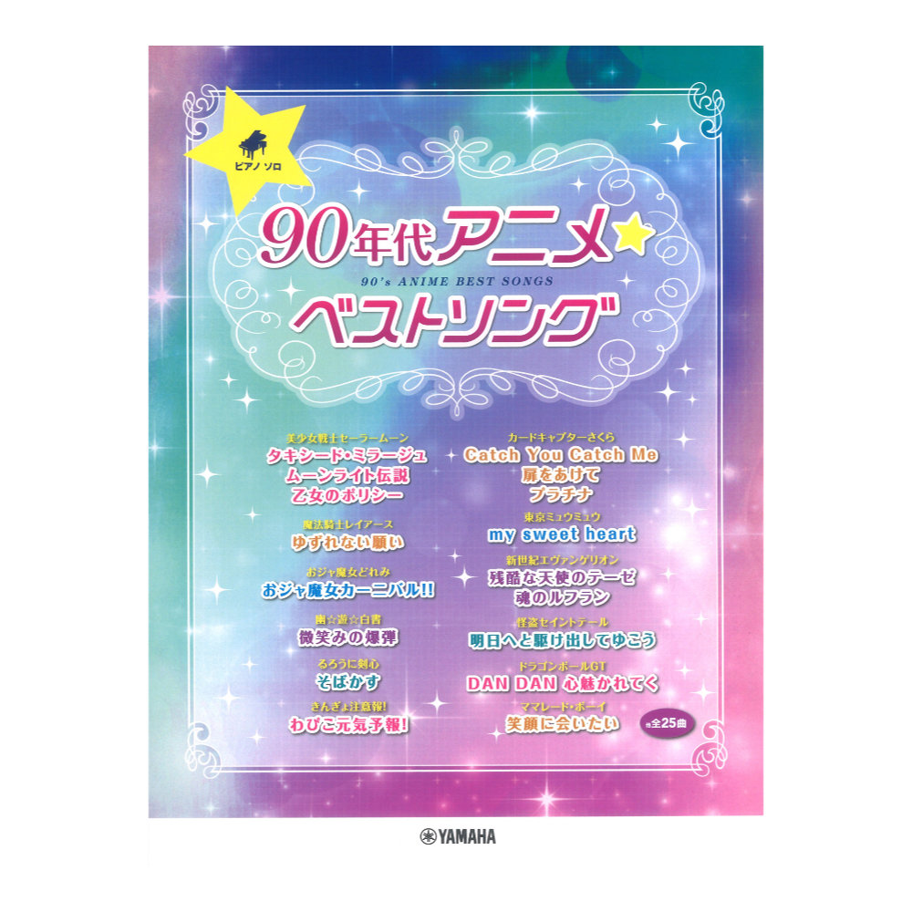 ピアノソロ 90年代アニメ☆ベストソング 【楽譜】「美少女戦士セーラームーン」や「カードキャプターさくら」「おジャ魔女どれみ」「あずきちゃん」「幽☆遊☆白書」など、人気漫画が多くアニメ化された90年代のアニソンを25曲集めました!TVサイズやワンコーラスにアレンジしているので、子供の頃に聴いたあのイントロ・あのメロディを、今、原曲に忠実に、手軽にピアノでお楽しみいただけます♪