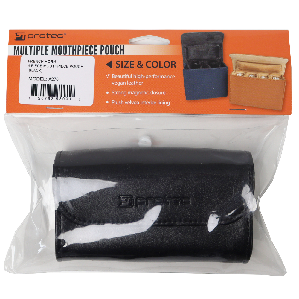 PROTEC プロテック A270 ブラック ホルン用マウスピースケース 1〜4本収納可能 美しく、高級感漂う Vegan Leather(合皮)。 内装裏地は、豪華なベルボア地。 開閉部はマグネット式で、しっかりとフィット。洗練されたデザインを演出。 ベルトやショルダーストラップに取り付ける為の、多用途の背面ループ。 ・カラー:ブラック