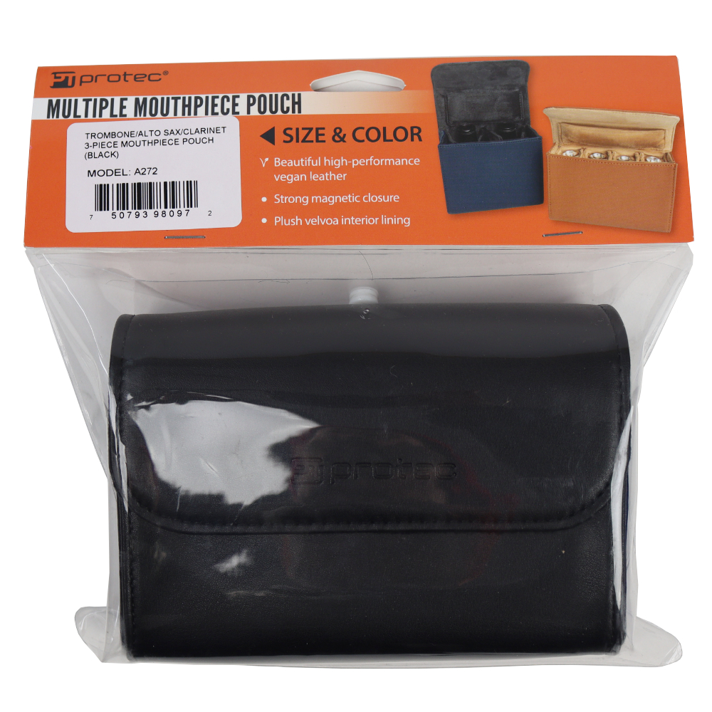 PROTEC プロテック A272 ブラック トロンボーン用マウスピースケース 1〜4本収納可能 美しく、高級感漂う Vegan Leather(合皮)。 内装裏地は、豪華なベルボア地。 開閉部はマグネット式で、しっかりとフィット。洗練されたデザインを演出。 ベルトやショルダーストラップに取り付ける為の、多用途の背面ループ。 ・カラー:ブラック