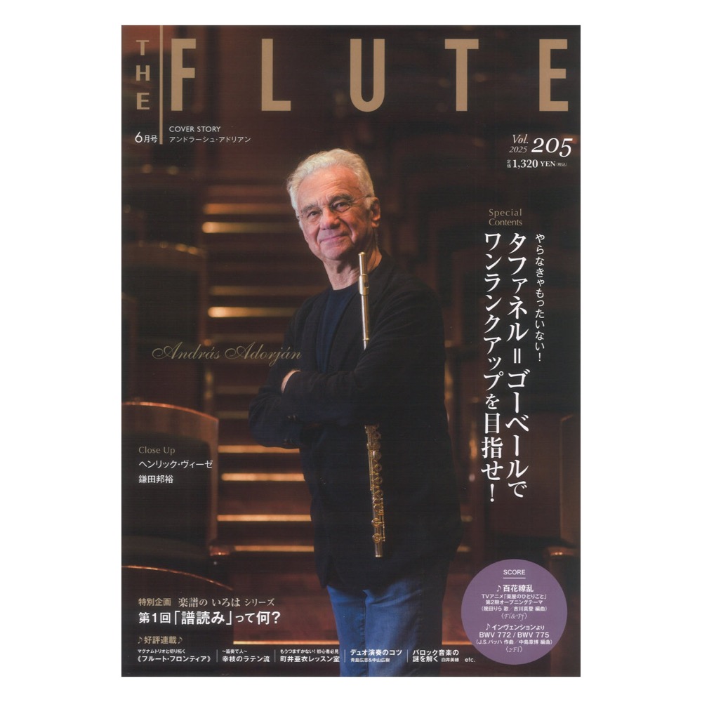 アルソ出版 ザ フルート vol.205【雑誌】 About it|商品解説 今号の表紙は現代のレジェンド・フルーティスト、アンドラーシュ・アドリアン氏。 昨年80歳を迎え、今もなお精力的な活動をし、表現豊かな演奏で音楽界を導いています。Cover Storyではフランスのフルート専門誌Traversieres Magazineに掲載された氏のインタビューを抜粋して掲載しています。 特集は「\やらなきゃもったいない!/タファネル=ゴーベールで ワンランクアップを目指せ!」です。初心者編・中上級者編と、レベル別の活用法をご紹介しています。「楽譜が音符で真っ黒!」とテキストを閉じたことがある方にこそ、読んでいただきたい内容です。併せて特別企画シリーズ「楽譜のいろは〈第1回「譜読み」とは?〉」も参考にしてみてください。