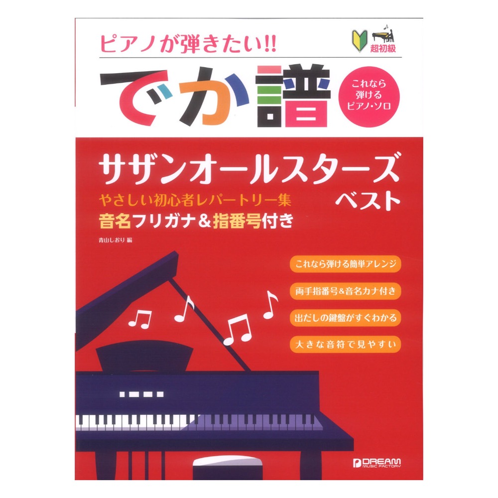 ドリームミュージックファクトリー 超初級 ピアノが弾きたい!! でか譜 サザンオールスターズ・ベスト やさしい初心者レパートリー集【楽譜】 最新曲を含むサザンオールスターズのベスト曲をやさしいアレンジで集めました。 見やすく大きな譜面と、音名ふりがな付きで楽しめるピアノ・ソロ曲集です。 音名ふりがな・指番号付なので運指を確認しながら弾けます。ピアノをはじめて間もない方で、まだ五線譜に慣れていない方でも、音名を見ながらゆっくりと始めてみましょう!