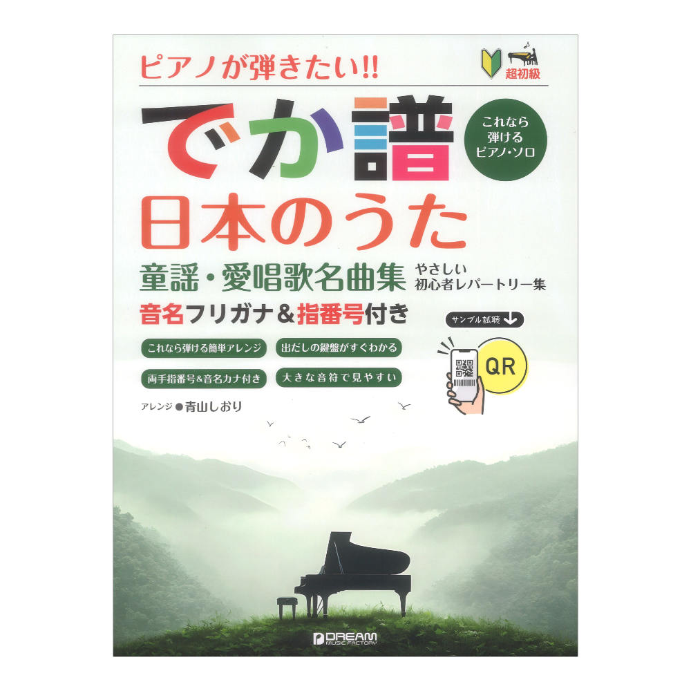 ドリームミュージックファクトリー でか譜 日本のうた 童謡・愛唱歌名曲集 やさしい初心者レパートリー 音名フリガナ&指番号付き【楽譜】 郷愁あふれる懐かしい曲の数々を、初心者でも演奏できるやさしいアレンジで集めました。 見やすく大きな譜面と、音名ふりがな付きで楽しめるピアノ・ソロ曲集です。 音名ふりがな・指番号付なので運指を確認しながら弾けます。ピアノをはじめて間もない方で、まだ五線譜に慣れていない方でも、音名を見ながらゆっくりと始めてみましょう! 全曲、QRコードからサンプル演奏が試聴できます。