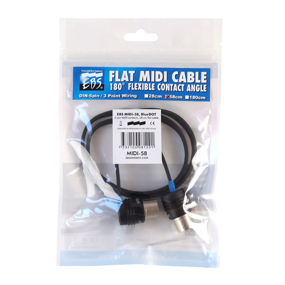 EBS MIDI-58 MIDI フラットケーブル フラット・パッチケーブルやフラット・DC ケーブルで好評を得ている EBS のフラットケーブル・シリーズ。プログラマブルな機器のコントロールに必要な MIDI ケーブルも新たに ラインナップ。エフェクトシステム全体の省スペース化に貢 献するため、180°自在にアングルを変更できるプラグデザインを採用し、コンパクトなシステムに最適な3種類の長さをラインナップしました。 ■ MIDI-58 (58 cm)