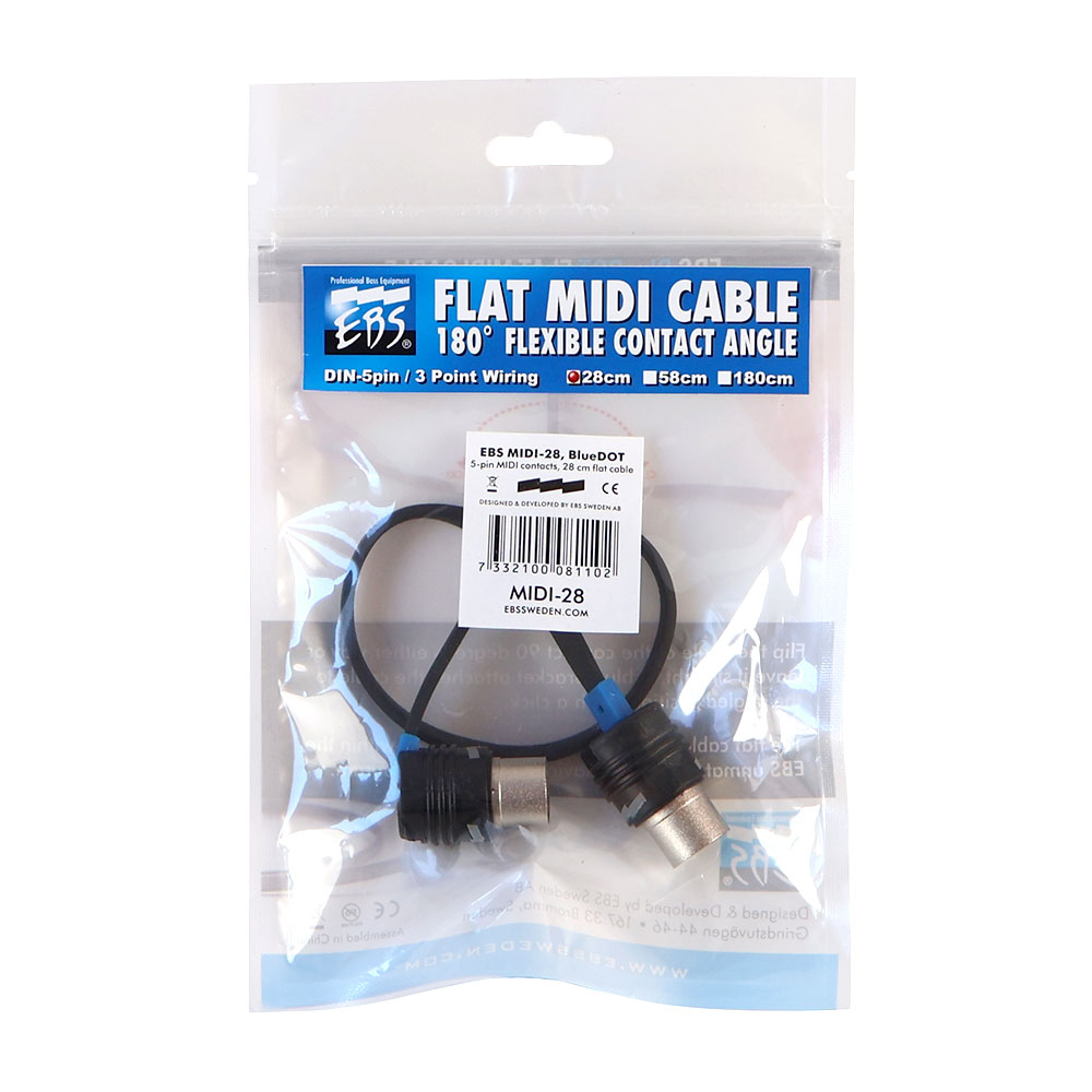 EBS MIDI-28 MIDI フラットケーブル フラット・パッチケーブルやフラット・DC ケーブルで好評を得ている EBS のフラットケーブル・シリーズ。プログラマブルな機器のコントロールに必要な MIDI ケーブルも新たに ラインナップ。エフェクトシステム全体の省スペース化に貢 献するため、180°自在にアングルを変更できるプラグデザインを採用し、コンパクトなシステムに最適な3種類の長さをラインナップしました。 MIDI-28 (28 cm)
