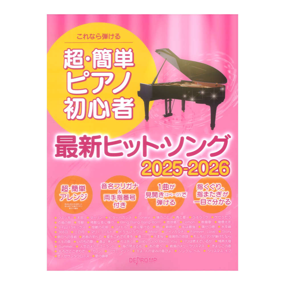 デプロMP これなら弾ける 超簡単ピアノ初心者 最新ヒットソング 2025-2026【楽譜】 J-POPなどのヒット曲や人気定番曲を、超・簡単なピアノ・ソロにアレンジしました。有名な部分だけを取り出して、ページをめくらずに弾ける2ページの長さに仕上げています。すべての音符に音名フリガナがついているので楽譜の苦手な方も安心。指番号と、指くぐり・指またぎのマーク付きで迷わず弾けます。